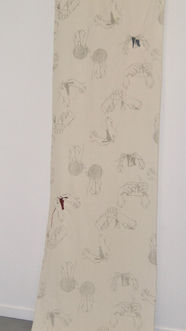 Looking at the idea of the multiple, these works negate the impersonal nature of mass production by using repeat processes to instead create one-off banners featuring patterns with domestic and handmade themes. By individually hand-printing the blocks of a repeat pattern, adding hand stitched detail, and using ink and thread to create variation, patterns break down and become organic, and every print becomes unique. This series was inspired by William Morris and his writing on the Arts and Craft movement.